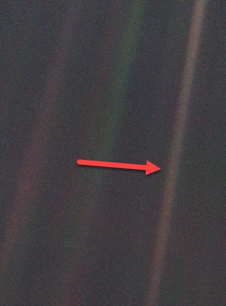 Not super impressive. And if you travel farther out in space, the moon disappears completely and the earth looks like a small speck among other small specks. We think of earth as a beautiful blue marble, but it only appears that way at close range. At long range it looks like a mote of dust: